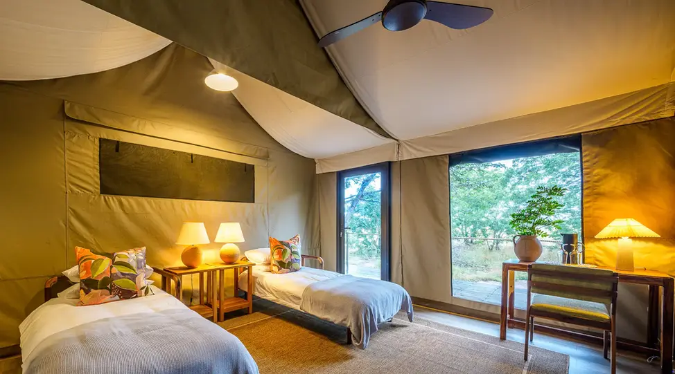 Nestled beneath teak trees and connected by sandy paths, Muddy Teak’s four raised tents and main area blend seamlessly into their environment. Elevated views toward the waterhole provide constant wildlife action, while the pool, firepit, and open-air lounge offer comfort in the wild. As one of Hwange’s most unique and secluded safari camps, Muddy Teak delivers an exclusive and unforgettable Zimbabwe safari stay.